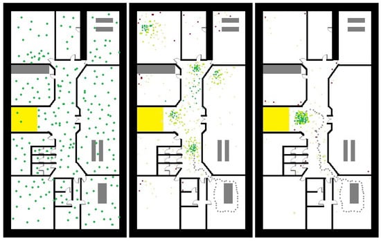 The basic particle filter process. (Left): particles are uniformly spread within the region of interest (). (Center): after a short walk (about 12 m), the particles begin to cluster around locations with high likelihood. (Right): after a total walk of about 25 m, the particles converge to a single position cluster. Note: Some particles still are far from the main cluster, but the expected error (which corresponds to the area) is relatively low.