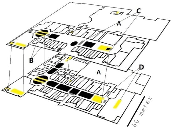 2.5D multicolored map example used in the advanced algorithm. White (marked by the letter “A”) represents accessible areas; black (marked as “B”) represents restricted regions (in this case, walls); gray (“C”) represents dynamic inaccessible areas (tables, in this case); and yellow ( “D”) represents stairs and elevators, in which elevation change is possible.