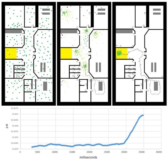 Particle filter for localization. (Left): Init state, the particles are uniformly distributed. (Center): using the short motion vector, the particles are beginning to organize into a few clusters. (Right): the particles converge to a single position cluster, mainly due to floor-change detection. The lower graph shows the barometer raw measurements () in time. The peak in the measurements corresponds to the 3 m change between the two floors. The detection of floor change allowed the algorithm to converge efficiently to the right location.