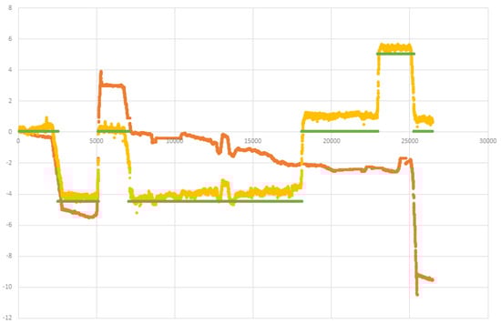 A core feature of the simulation is its ability to generate fake raw data. An “eyed” measurement is not enough to properly test the algorithm’s performance; the need for a ground truth measurement comparison is well understood. The simulator is capable of generating raw noisy data, as shown in Figure 10, as well as real data alongside the ground truth of that data. This enabled us to test our algorithm accuracy more precisely by comparing its reports to the ground truth. As demonstrated in Figure 11, our algorithm lowered the maximum error from approximately 16 m to approximately 7 m, but only for a short time, after which the report stabilized with a maximum error of approximately 1.5 m. All the presented simulations figures are of experiments that was conducted in a building with an area of 800 square meter.