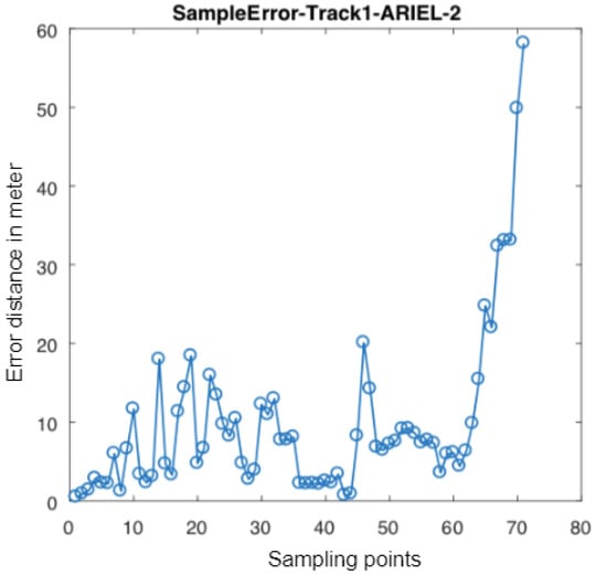 Error estimation of each of 70 points along the evaluation process. A travelator (moving walkway) in the evaluation path probably generated the large reported error from significant compass drift in the last few points.