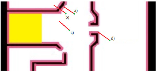 Consider the use of a single point light detection and ranging (lidar) sensor (or any other ranging sensor): The red vector represents such a range measurement (length and angle). Particles (a) and (d) represent good sensing points because they are within the right range (pink region). The grades of Particles (b) and (c) will be decreased. The case of Point (b) might be due to temporal blockage (e.g., human), whereas Point (c) most probably is in the wrong location.