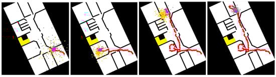Particle filter algorithm progress over time (from left to right). The optical sensor data affected the orange particles, whereas the smartphone’s internal compass affected the gray particles. Having both particle types allows a more robust solution.