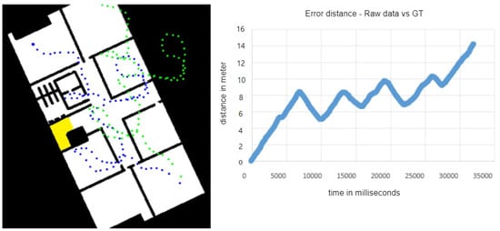 (Left): The green dots are the raw data, and the blue dots are the ground truth. (Right): The graph shows the error distance between them.