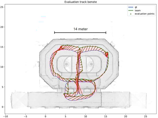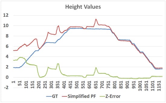 Since 2014, Microsoft Corporation has organized an annual Indoor Localization Competition (see [6] for the 2014–2017 evaluations). In the 2018 competition, we implemented a preliminary version of the suggested particle filter (). In general, the system was design to improve existing (such as Google’s Indoor Maps ) from an expected accuracy of 10 m to 20 m to an accuracy for 1 m to 2 m (). Overall, the system performed as expected, allowing a rapid convergence—within 10 to 15 s (for 15–20 steps)—of the particle filter. Figure 12 presents the evaluation of the system with respect to the ground truth, and Figure 13 presents the z-convergence process, in which the floor position was accurately found after about 40 s. Figure 14 and Figure 15 show the different convergence natures of the particle filter in the case (when the floor is unknown) and the case (when the floor is given).The evaluation of our algorithm led us to the first place in the competition, see Figure 16 and Figure 17. system result marked as . A list of the other competitors and their system techniques is presented below: