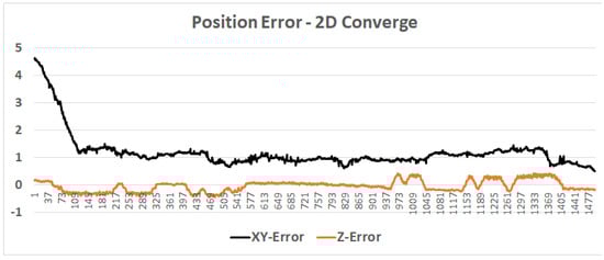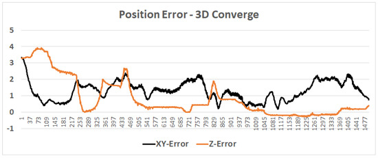 A particle filter in action: an (about) 120 s test, in which the position converged from an error of 3.5 m to a submeter within 40 s and to (about) 0.1 m error after 80 s. Note: the z value is defined according to the best particle height (no filter) in order to demonstrate the convergence process.