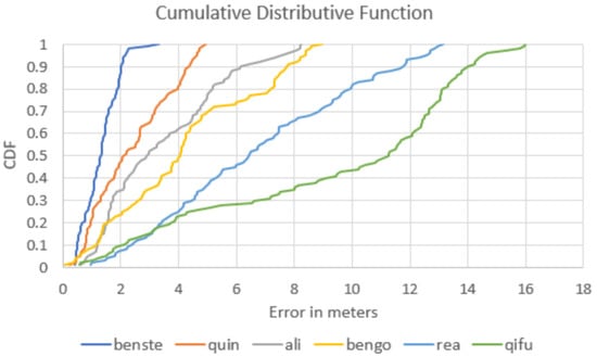 Cumulative Distributive Function: of the error in meters as tested in Microsoft Indoor Positioning competition 2018. The STEPS (benste) reached an average accuracy of 1.3 m.