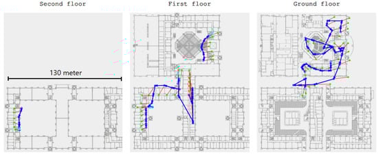 Figure 8, Figure 9, Figure 10 and Figure 11 represents a 20 × 40 m University building in which lab experiments and simulations were performed. Eventually, the method we embraced was the smartphone’s built-in compass, mainly due to the high sensitivity of the optical flow’s virtual sensor, which different lighting and fast movements easily affected and thus could lead to serious faults.