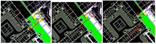 The negative effect of using geolocation service. (Left): ground truth. (Center): STEPS report without geolocation service resample. (Right): STEPS report with geolocation service resample. In this example, a significant positioning error in the geolocation service caused a major drift in the system because the true position was often outside of the particle filter .