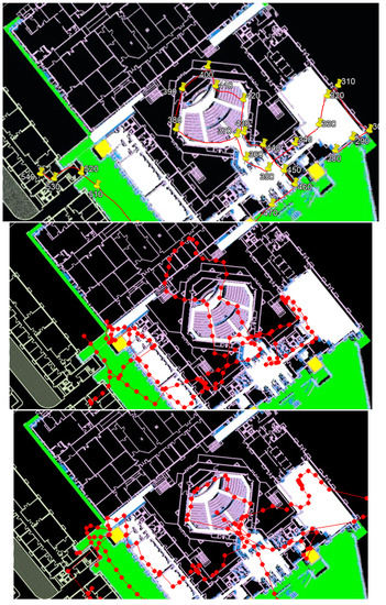 The main findings regarding the STEPS’s relatively low accuracy in the 2019 IPIN competition were due to some reliance of the system on geolocation service signals. As previously explained, our system relies in a certain way on software sensor. This sensor reports the current coordinates with some accuracy; its purpose is to avoid cases of Kidnapped Robot. The problem in this competition trial was that the algorithm did not consider the service’s reported accuracy. In action, the location provided reports with very low accuracy, which caused severe drift in the STEPS system (Figure 20 and Figure 21). Thus, the question is not whether, but only to what extent, to rely on the system.