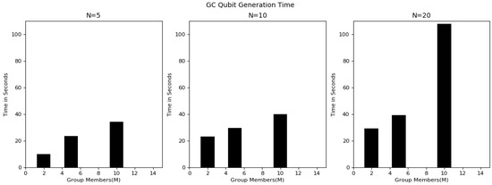 Figure 7 shows the GC qubit generation time in the key-sharing process. This is the time the GC required to guess the bases upon receiving of the key from the user. The time in this process increased with an increase in group users. From