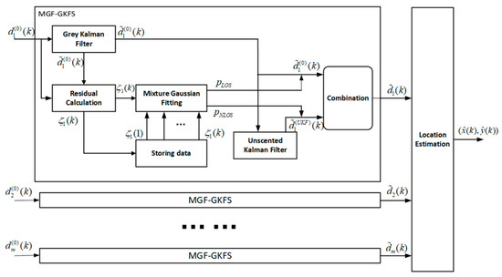 The flowchart of our algorithm is depicted as Figure 1. The distance value is measured by the sensor nodes and the position estimation is calculated through this filter. Firstly, in order to mitigate the driving noise and initially correct NLOS errors, we utilize GKF to pre-process the measurement. Secondly, we calculate the residual value, which is the difference between the filtered result and the measurement, and save it in the storage module. Thirdly, the historical residuals over a period of time and current residual are utilized to train GMM. Double Gaussian functions are used in this paper to fit these residuals and two clustering centers can be obtained. The degree of membership (probability of propagation condition) is easily obtained through calculating the Euclidean distance from the current residual to the cluster centers. Fourthly, UKF with a relatively large covariance matrix is used to further process the weak NLOS errors after the strong NLOS errors are partially eliminated by GKF. Finally, the filtering results of multiple filters (GKF and UKF) are mixed according to the degree of membership (probability of propagation condition) calculated in a mixture Gaussian fitting step. The maximization likelihood algorithm (ML) is used to estimate the coordinate.