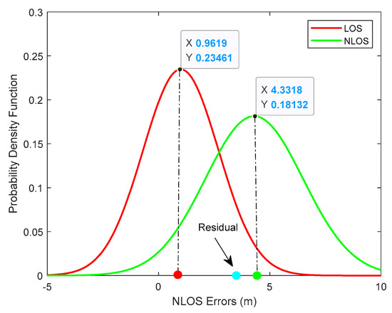 where is the positive NLOS error obeying various distributions (e.g., Gaussian, uniform and exponential). We assume the NLOS error is independent on the sensor noise and obeys different NLOS PDF in different environments as Equations (5)–(7).