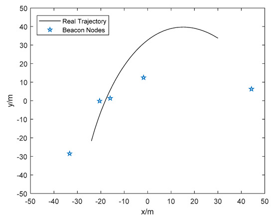 The trajectory and the position of beacon nodes in one Monte Carlo run.