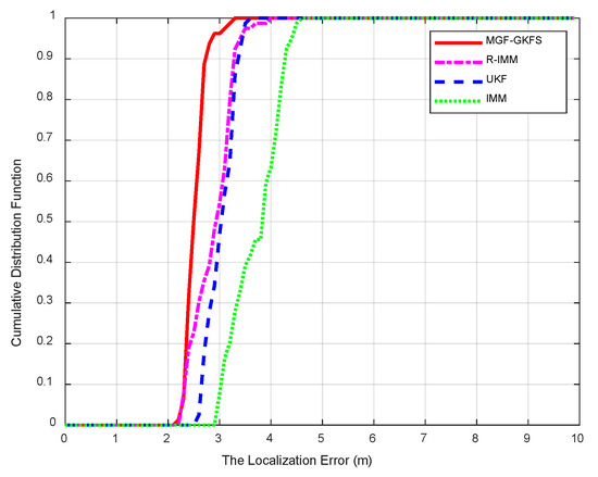 Figure 12 shows the CDF of localization errors obeying exponential distribution . The MED values of MGF-GKFS, R-IMM, UKF and IMM are, respectively, 2.39 m, 2.61 m, 2.94 m and 3.37 m. The improvements compared to R-IMM, UKF and IMM are 8.1%, 18.5% and 29.0%, respectively, which illustrates the obvious enhancement. The 90th percentile localization errors of MGF-GKFS is concentrated within 3 m; whereas for R-IMM, UKF and IMM the 90th-percentile increases 3.3 m, 4.0 m and 4.2 m, respectively. The improvements compared with R-IMM, UKF, IMM are 9.1%, 25.0% and 28.6%, respectively. Under the exponential distribution, the performance of MGF-GKFS has been greatly improved compared to other algorithms.