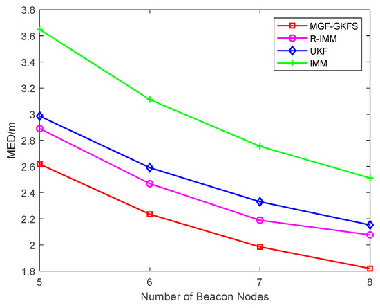 To investigate the performance of MGF-GKFS with the number of beacon nodes increasing, the MED values are depicted as Figure 6 when the number changes from 5–8. It can be seen that the MED decreases when the number of beacon nodes is increasing. From this figure, MGF-GKFS obviously outperforms than other algorithms. For example, if the number is 7, the MED values of MGF-GKFS, R-IMM, UKF, IMM are, respectively, 1.98 m, 2.19 m, 2.33 m and 2.75 m.