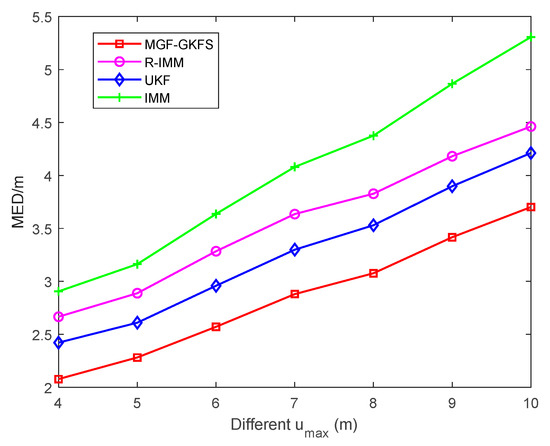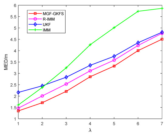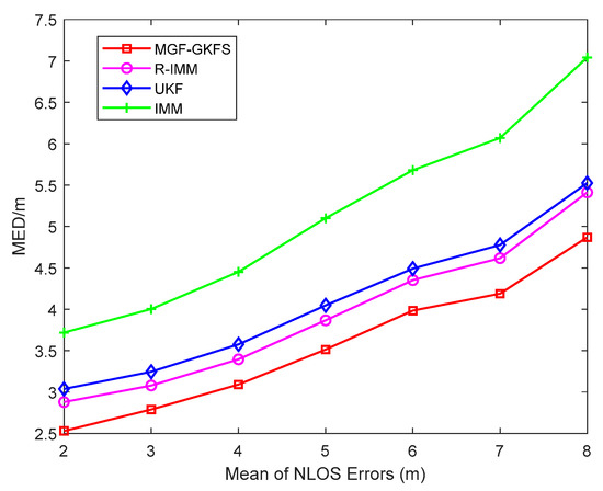 Furthermore, the trend of the MED is depicted as Figure 7 when changing the mean of NLOS errors from 2 to 8. The result shows the trend is on the rise with the mean of NLOS errors increasing. MGF-GKFS has the best performance under all the enumerated mean values of Gaussian distribution. The average MED values of MGF-GKFS, R-IMM, UKF and IMM are respectively 3.56 m, 3.94 m, 4.10 m and 5.15 m.