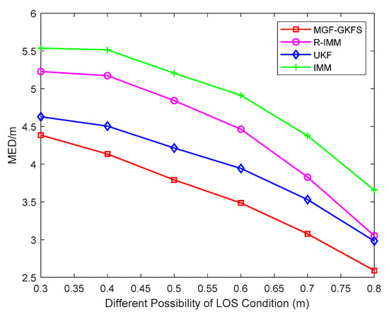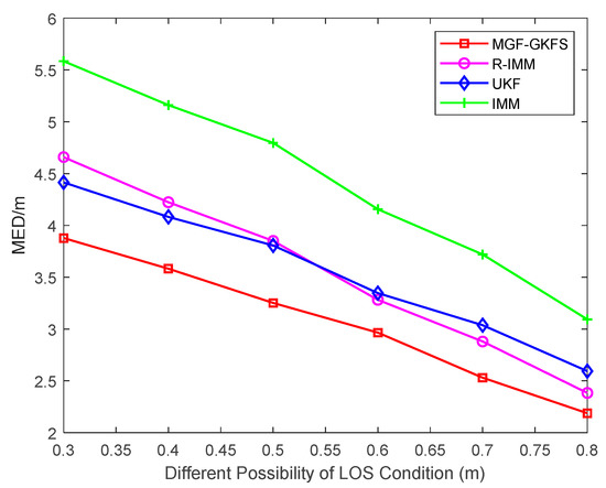 To further explore the positioning accuracy of MGF-GKFS, Figure 8 gives the MED results under different LOS possibilities varying from 0.3–0.8. The figure shows the MED of MGF-GKFS is generally smaller than the other three methods. The average MED values of MGF-GKFS, R-IMM, UKF and IMM are 2.86 m, 3.30 m, 3.24 m and 4.12 m, respectively. The result illustrates that MGF-GKFS is much better when coping any of the probability that NLOS errors contain.
