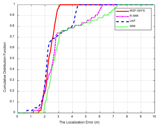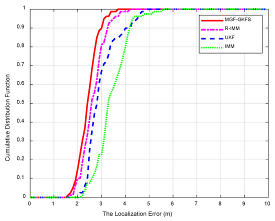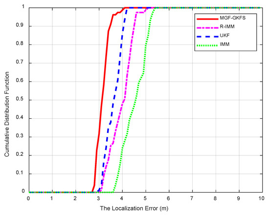 The CDF of positioning errors is shown as Figure 15. The average MED values of MGF-GKFS, R-IMM, UKF and IMM are, respectively, 2.2699 m, 2.9285 m, 2.5087 m and 3.2078 m. The improvements of MGF-GKFS compared to R-IMM, UKF and IMM are 22.4%, 9.5% and 29.2%, which illustrates obvious enhancement compared with the three other algorithms.