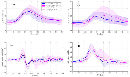The initial burst of the median EMG profile at 0–150 ms (Figure 3a) was not transferred to an increase of the estimated muscle force (Figure 2d), neither could it be observed on the MC neck signal (Figure 3b), regardless of the awareness condition. Based on the video recordings, no indications of a motion artefact were found. A further inspection of the EMG signals showed a greater tendency for the burst to appear in the aware trials. The peak of the burst appeared at 80.1 ± 19.7 ms in the aware trials and 109.2 ± 23.0 ms in the unaware trials (p = 0.003), while the burst decay to the local minimum lasted 65.8 ± 23.1 ms and 61.7 ± 18.9 ms, respectively. Moreover, the onset of the EMG and MC signals preceded the onset of the neck-muscle load F (Table 4). Given that F was estimated from an inverse-dynamics analysis, according to Equations (2)–(4), the onset of F needed to maintain the dynamic equilibrium occurred only after the head motion was initiated at approx.100–200 ms after the impact (Figure 2). Hence, for both awareness conditions, the initial EMG burst can be related to the reflexive activation evoked by the visual and vestibular stimuli at the impact [1,6]. The burst was more noticeable in the aware trials (Table 4), which were conducted as the first set of conditions in the study. Although the attenuation of the burst in the unaware trials could be partially attributed to the habituation of the volunteers, as observed in previous studies comparing first trial responses with subsequent ones [7,58], the overall dynamic response showed that the volunteers were more startled in the aware conditions.