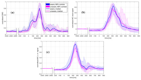 The time-history profiles for the EMG, MC neck and neck-muscle force F were compared based on their cross-correlation, specifically the cross-correlation coefficients rEMG-MC, rEMG-F and rF-MC (Table 3). The assumption of normality was violated only for rEMG-MC in unaware trials (p = 0.019). A two-way repeated measures ANOVA showed a significant difference in the cross-correlation coefficients between the rEMG-MC, rEMG-F and rF-MC (F(2,38) = 28.01, p < 0.001, = 0.60), but no effect of the awareness conditions (F(1,19) < 0.01, p = 0.981, < 0.01) or the interaction between the two factors (F(1.50,28.49) = 0.22, p = 0.743, = 0.01). Post-hoc tests revealed that the rF-MC was significantly bigger than the rEMG-MC and rEMG-F for both awareness conditions (p < 0.001). The cross-correlation coefficients indicate that the neck-muscle load F (Figure 2d) was more closely correlated with the MC signal than with the EMG signal (Figure 3a,b).