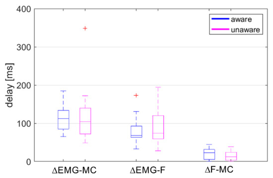 Time delays estimated with cross-correlation between EMG, MC neck, and neck-muscle load F. Positive sign of Δ indicates that the MC neck is delayed relative to the EMG (ΔEMG-MC), the F is delayed relative to the EMG (ΔEMG-F), and the MC neck is delayed relative to F (ΔF-MC). Depicted: median value, 25th- and 75th-percentile values, min-max range and outliers (red), aware (blue), unaware (magenta).