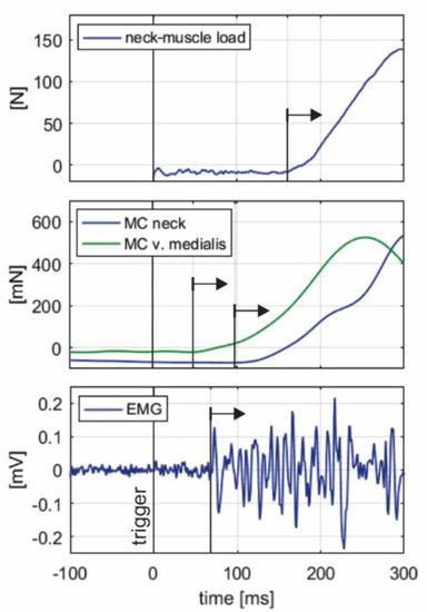Figure 5 shows representative initial segments of neck-muscle load F, MC neck and MC v. medialis signals, and EMG signal, collected in a single trial, with visually determined onset latencies.