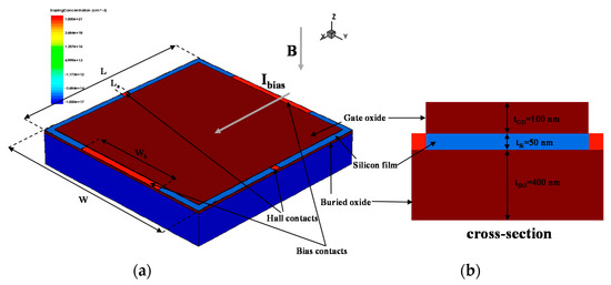 (a) 3D geometric model, and (b) cross-section of the fully-depleted silicon-on-insulator (FD-SOI) Hall sensor for the technology computer aided design (TCAD) simulation.