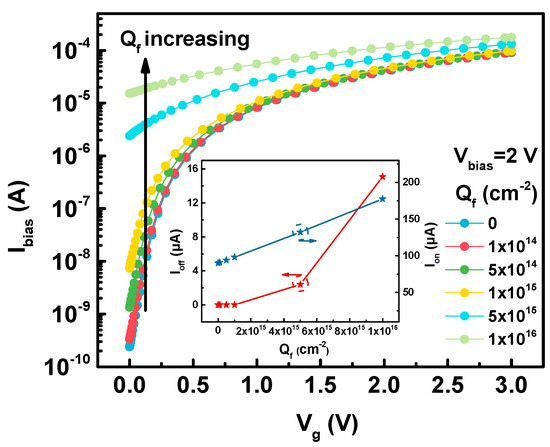 As described in Section 2.3, the effect of the TID on the device can be made equivalent by setting the fixed positive charge in the oxide layer. Under low-dose radiation conditions, the trap charge density (i.e., fixed charge density in the simulation) in the oxide induced by radiation is linearly related to the radiation dose, and the trap charge density tends to saturate at medium to high radiation doses [30]. Therefore, different fixed charge densities (Qf) are equivalent to different radiation doses. The transfer characteristic curve of the FD-SOI Hall sensor with different fixed charge densities is presented in Figure 2. The fixed charge-induced off-state leakage current (Ioff, Ibias@Vg = 0 V) and the on-state current (Ion, Ibias@Vg = 3 V) are extracted and displayed in the inset.