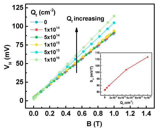 Hall voltage (VH) versus magnetic induction (B) simulated for sensors with different fixed charge densities (Qf) in the oxide. The inset shows the variation of the absolute sensitivity (SA) with fixed charge density.