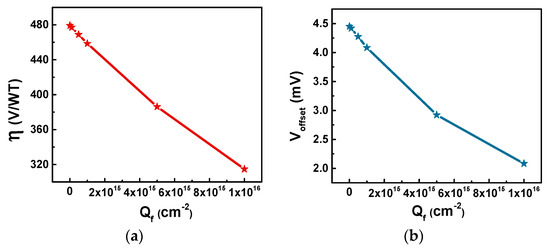 In addition to absolute sensitivity, efficiency and offset voltage are also extracted, as shown in Figure 4. Both the Hall voltage and the bias current increase because of the existence of a fixed charge, but the bias current growth rate is greater, which therefore leads to a decrease in the efficiency of the sensor. The efficiency of the sensor drops from 479.2 V/WT to 314.7 V/WT after adding 1016 cm−2 fixed charge, while the offset voltage of the sensor decreases from 4.45 mV to 2.1 mV. The offset voltage is related to the symmetry, uniformity, resistance, and other factors of the sensor [20]. The existence of the fixed charge in the oxide layer causes the changes of the electric field and even the resistivity of the silicon film, so that the offset voltage changes.