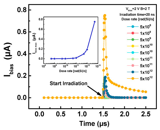 The TDR effect investigates the changes in sensor characteristics at the moment of transient radiation like a nuclear explosion. For the TCAD simulation, a high dose rate from 5 × 108 rad(Si)/s to 5 × 1012 rad(Si)/s with 20 ns duration is established. Meanwhile, the B of 2 T along the negative direction of the z-axis is applied. TDR-induced photocurrents under off-state (Vg = 0 V) are detected at Vbias = 2 V, as shown in Figure 5.