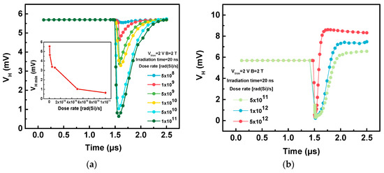 The changes in Hall voltage (VH) during the irradiation of (a) dose rate = 5 × 108~1 × 1011 rad(Si)/s and (b) dose rate = 5 × 1011~5 × 1012 rad(Si)/s. The inset in (a) is the change in minimum Hall voltage (VH min) with dose rate.