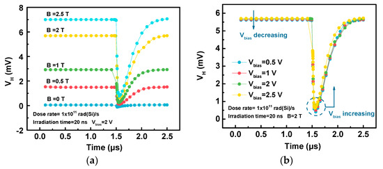 During irradiation with a dose rate of 1 × 1011 rad(Si)/s, the variations of Hall voltage (VH) under different (a) magnetic inductions (B), and (b) bias voltages (Vbias).