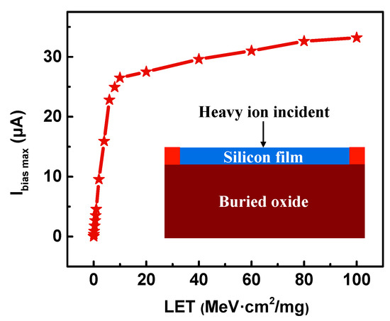 After heavy ions enter the sensor, a large number of e-h pairs are generated along the particle track, which are collected by the bias contacts to form the transient current. Moreover, with the increase of the LET, the peak value of Ibias (Ibias max) keeps increasing, as shown in Figure 8. This is because the larger the LET is, the more e-h pairs are generated. So the charge collected by the bias contacts is increased accordingly. Moreover, it can be seen from Figure 8 that when the LET is lower than 10 MeV·cm2/mg, the Ibias max increases faster with the increase of LET. Then, after 10 MeV·cm2/mg, the increasing trend is gentler. Through fitting, the slopes of the curves before and after 10 MeV·cm2/mg are 3.38 μA/(MeV·cm2/mg) and 0.077 μA/(MeV·cm2/mg), respectively.