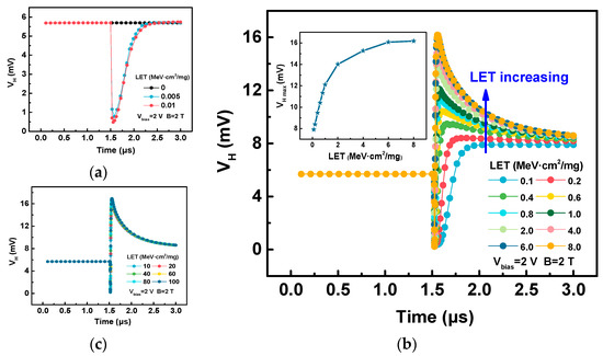 Figure 9 depicts the changes in the Hall voltage with time under different LET ranges. Firstly, when the ions incident with low LETs (Figure 9a), the Hall voltage will first decrease and then return to the initial value. Secondly, when the LETs are at medium values (Figure 9b), the Hall voltage will first decrease, then increase to the maximum value (VH max), and finally decrease to a fixed value. It can be observed that the VH max increases with the increase of the LET, and gradually tends to saturation. Thirdly, when the LETs are in a higher range, the change of the Hall voltage during the heavy ion incidence is basically the same, that is, it decreases rapidly, then increases to the VH max, and finally decreases to a fixed value.
