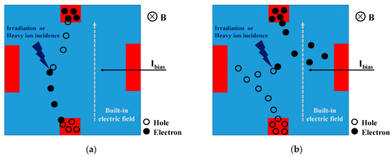 First, under the effect of bias voltage and magnetic induction, a Hall voltage is generated and a built-in electric field is formed in the direction of Hall contacts, as shown in Figure 10a. Secondly, fewer e-h pairs are generated because of the low-energy nuclear explosions or heavy ion incidence. They will move under the action of the built-in electric field, thereby weakening the built-in electric field, which will cause the transient Hall voltage to decrease. Finally, when all the generated e-h pairs are collected, the Hall voltage returns to the initial value.