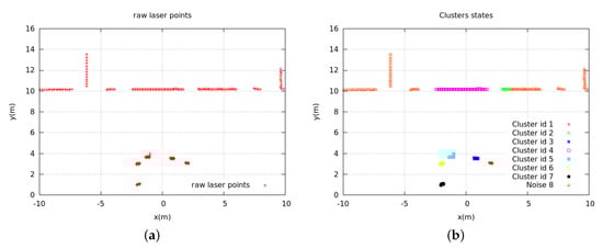 Clustering results. (a) raw laser points; (b) DBSCAN results.
