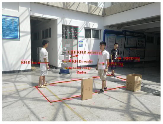 The feasibility of the proposed method in this paper is verified by using the SCITOS G5 robot. We conducted experiments in an indoor environment that is shown in Figure 3. This robot integrates a UHF RFID reader, named Impinj Speedway Revolution R420, two circularly polarized antennas of the type Laird Technologies S9028, and a laser range finder, named SICK S300. The RFID reader provides a maximum measuring distance up to 10 m. The laser range finder provides a maximum measuring distance up to 29 m and a horizontal scanning angle of with a scanning resolution of .