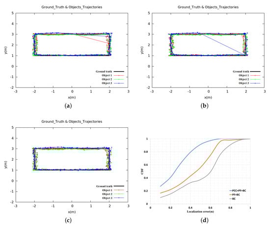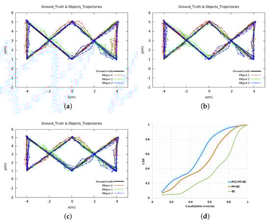 Comparision of the estimated trajectories based on different approaches. (a) BC; (b) PF + BC; (c) PCC + PF + BC; (d) CDFs.