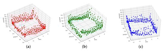 The DBSCAN algorithm is a spatial clustering algorithm based on density [39]. The remarkable advantage of this algorithm is that the algorithm is fast, and it can divide the regions with enough high density into a group, which effectively deals with noise points and quickly finds spatial clustering of arbitrary shape. The experiment divides the laser points into core points, boundary points, and noise points. For a given point, if the number of adjacent points in the neighborhood with radius is greater than , then this point is regarded as the core point. If it is within the neighborhood of the core point, we treat it as a boundary point; otherwise, we treat it as a noise point. After clarifying the categories of the respective laser points, the core points and the boundary points are merged into one cluster. Finally, we will get clusters, where , and we can estimate the central coordinate of each cluster as: . Figure 2 shows one example of the clustering result.