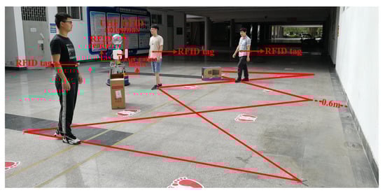 The experiments have been tested in a space that is a rectangular area of 4 m × 2 m, as shown in Figure 3. The robot had been placed one-meter perpendicular to the rectangle’s long side. During the experiment, the position of the robot remained unchanged. The RFID tags worn by the three persons moved along the edge of the rectangle. Each of them walked three circles, and each person’s speed was different (but each person’s speed was kept constant while walking). We set a marker every one meter on the ground shown by the red line in the Figure 3 in order to calculate the positioning error. Each time the experimenter went across to a mark, the software records the time when he arrives and stores it in the database. We calculate the average velocity of the experimenter between the two adjacent markers, calculate the coordinates of their position at each moment, and treat this coordinate as the true position of the experimenter. Because the distance between adjacent marks is short, the ground truth error can be ignored. Subsequently, the position estimated by the algorithm is compared with the ground truth to measure the localization error, which is defined as the Euclidean distance between the estimated position and the true position. We think that, if the error is less than 0.8m, the cluster and tag ID are successfully matched. The matching rate is obtained by comparing the number of clusters successfully matched with the total number of clusters.