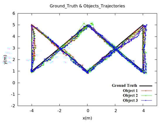 We expand the original experimental scene to an area of 8 m × 4 m and move it to the area closer to the wall in order to verify the robustness of the whole system. The specific experimental scenario is shown in Figure 6. The experimental parameters are set to be the same as the original experimental parameters, and the result is shown in Figure 7. As can be seen from Figure 7c, as compared with Figure 7a,b, the object’s estimated paths are basically consistent to the ground truth, and the average localization error of all humans is 0.52 m, which is only 0.19 m worse than the original experiment. The BC-based approach (BC) cannot locate the moving objects very well, the localization error is 0.90 m. Although the particle filter-based approach (PF + BC) improves the accuracy when compared to the BC-based approach, the result is still not good enough: the localization error is 0.76 m. The experimental results show that our approach is able to achieve identification and localization of multiple objects with good positioning accuracy.