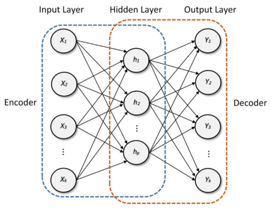 where and are the weights and biases matrices of the decoder process, respectively, and is the output of the AE, which has the same dimension as the input . A typical structure of a single-layer auto-encoder is show in Figure 1.