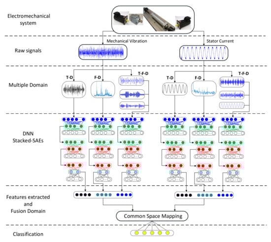 The use of a single domain space is popular in the application of fault diagnosis in electrical machines. However, different domain spaces in the signals considered through acquisition process may have valuable and implicit information; existing methodologies that implement advanced DL techniques do not simultaneously extract information from multiple spaces to characterize the machine condition. Moreover, in industrial processes involving rotating systems, the signals contain dynamic and noisy data, which could lead to poor overall performance of machine health monitoring systems. Therefore, this paper proposes a parallel training model formed by using T-D data, F-D data and T-F-D data. The data from the different domains for mechanical vibration and stator current signals are used as inputs of different SAEs. This improves the ability to capture different characteristics in different domains and relevant information on the condition of the machine.