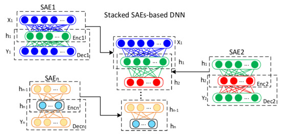 Several auto-encoders are stacked to build a DNN, as shown in Figure 3. The stacked-SAEs-based DNN aims to extract intrinsic relationships and establish the mapping of complex features between the sampled signals and fault conditions of EMDS. Therefore, this architecture contains multiple hidden layers, each of which can learn a non-linear transformation from the previous layer. This layer-by-layer training method proposed by Hinton et al. [42] can be used to train a DNN. The number of input neurons is the dimension of data points considered for each domain. An unlabeled , and training set is used for DNN layer-by-layer unsupervised training.