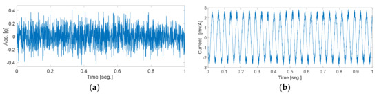 Raw data from the same time step. (a) Time domain raw vibration signal and (b) raw current signal.