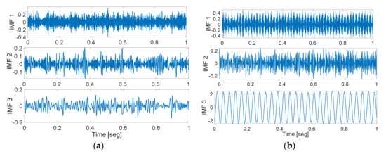 In order to characterize the condition of the machine in a more comprehensive way, parallel processing of the vibration and current signals is carried out. This way of considering the information also allows us to have a generalizable methodology in which, if the nature of the fault is unknown, that is, if it is of mechanical or electrical origin, this proposal is capable of adapting to the most descriptive source of information to characterize the different faults present. Thus, each sample is a raw vibration signal and raw current signal containing 2000 data points. Meanwhile, FFT and EMD are applied to each sample signal in order to obtain F-D and T-F-D data, and thereby generate a Multiple-Domain-Features (MDF). Therefore, the raw data, F-D data, and T-F-D data contain 2000, 1000, and 2000 data points, respectively. For the T-D, raw vibration signals and raw current signals were used, as shown in Figure 5. An example of the resulting spectra for a vibration and current signal in the frequency domain are shown in Figure 6. Three main intrinsic mode components are shown in Figure 7.