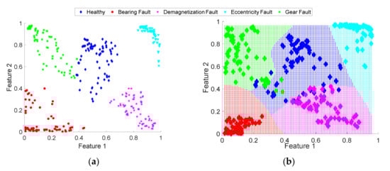 Finally, for the fault classification process, a multilayer ANN-based classifier with a sigmoid function was implemented, with which it is also possible to obtain the probability of belonging of each class. Through this classifier, it is possible to obtain the decision regions for each condition of the system, as shown in Figure 8b.