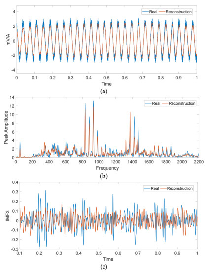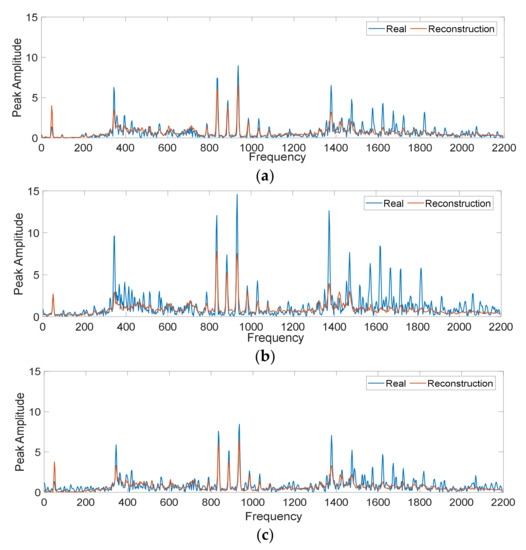 From Figure 10b, it can be seen that increasing the RMS value causes an increase in the amplitude of the harmonics for the frequency spectrum, while in Figure 10c, it can be seen that the effect of increasing noise is only perceived in amplitude increase at low frequency values. For this practical case study, an MSE of 0.0097 was obtained for the reconstruction of the healthy condition, an MSE of 0.0120 for the reconstruction of the healthy condition with the modified RMS and an MSE of 0.0110 for the reconstruction of the healthy condition with noise added. These MSE values were similar for each of the test cases of the experiment. It should be noted that these MSE values are within the range of values obtained during the training process.
